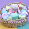 INGREDIENTES:1 doudou (mantita de apego), 2 babitas de hombro, 2 baberos, 2 mini toallitas, 3 pares de medias, 1 banner con el nombre del bebé y 1 tarjeta de bienvenida con el nombre del bebé.Viene en canasta con asa.•Mide aprox: 28cm x 20cm x 26cm de alto.-Cantidad de elementos: 15