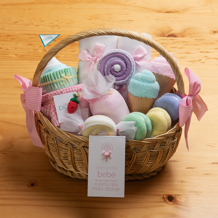 INGREDIENTES: 2 pañales bombasí, 1 babita de hombro, 1 babita chica, 1 babero, 3 babitas de felpa, 4 pares de medias, 1 body, 1 frasco de vidrio, y 1 tarjeta con el nombre del bebé.Viene en canasta con asa, envuelta en tul.•Mide aprox: 28cm x 20cm x 26cm de alto.-Cantidad de elementos: 16