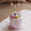 banderines con borlas y una tarjeta con el nombre del bebé.